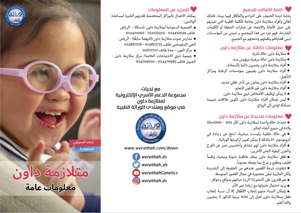 مطوية المعلومات العامة لمتلازمة داون بنسخة للطباعة موجودة على الرابط التالي:
