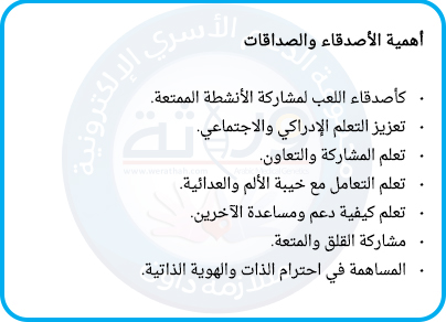 أولا، الصداقات وفرص اللعب مع الآخرين تقدم طرقًا ممتعة لقضاء الوقت. ويقدم اللعب المشترك والنشاطات الترفيهية فرصًا للتعلم الإدراكي والاجتماعي. ويكتشف الأطفال كيفية التعاون مع بعضهم وكيف يكونوا جزءًا من مجموعة، يتعلموا كيف يتوافقوا مع بعضهم ويختبروا كلًا من السلوكيات الاجتماعية الإيجابية والسلبية من خلال اللعب، ويتعلمون كيف يكسبون الأصدقاء ويحافظون عليهم، وكيف يعتني الأصدقاء ببعضهم البعض ويدعمون بعضهم. حيث يتعلمون أن الأصدقاء يتشاركون التجارب والصعاب سويةً، ويتعلمون أن الصداقة تعتمد على الإعجاب والمراعاة المشتركة وأن الأصدقاء يجعلون الشخص يشعر بشعور جيد تجاه نفسه، كما يتعلمون أي نوع من الأشخاص هم، من التغذية الراجعة وردود فعل أصدقائهم وزملائهم ضمن المجموعة. وتشير هذه القائمة الوظيفية التي تنطوي تحت مفهوم الصداقة إلى أن شح الأصدقاء ورفقاء اللعب مدعاة للقلق، ويمكن أن يقود الانطواء في الأطفال ذوي النمو الطبيعي إلى قلة احترام الذات وإلى سلوكيات صعبة وأداء مدرسي ضعيف.