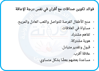 من الواضح أن هناك فوائد هامة تنتج من وجود أصدقاء من نفس العمر ممن يحظون بنمو طبيعي، وأصدقاء من نفس العمر وفي نفس مستوى الإعاقة في التعلم، ولذلك يجب على الأهل التأكد من توفير الاثنين. أثناء نمو الأطفال ذوي متلازمة داون في المدرسة الابتدائية يزداد إدراكهم لوجود اختلافات بينهم وبين غيرهم من الأطفال ويكون من المهم وجود أصدقاء من الذين لديهم نفس الإعاقة ليدعموا فهمهم لحالتهم. يستطيع الأفراد الذين يعانون من أي إعاقة من المراهقين والبالغين معرفة أهمية وجود أصدقاء من ذوي نفس الإعاقة ليجدوا فهمًا ودعمًا متبادلين، وتكون صداقاتهم مع أقرانهم الأصحاء بنفس الأهمية بالنسبة إليهم، فالصداقات المتنوعة تساهم في حياة الفرد بأشكال مختلفة.