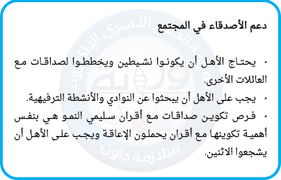 يشكل معظم الآباء صداقات مع عائلات يملكون أطفالًا معاقين قبل سنوات المدرسة ومن المهم الإبقاء على هذه الصداقات بعد التزام الأطفال بدوام مدرسي كامل وخاصة عندما يلتحقون بمدارس عامة، لأن الطفل الذي لديه متلازمة داون ويداوم في مدرسة عامة يكون غالبًا الطفل الوحيد في درجة التأخر التعلمي وبالتالي لن يجد هذا الطفل أصدقاء من ذوي الإعاقة في مدرسته.