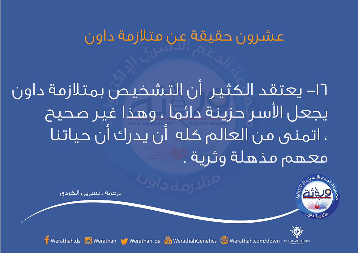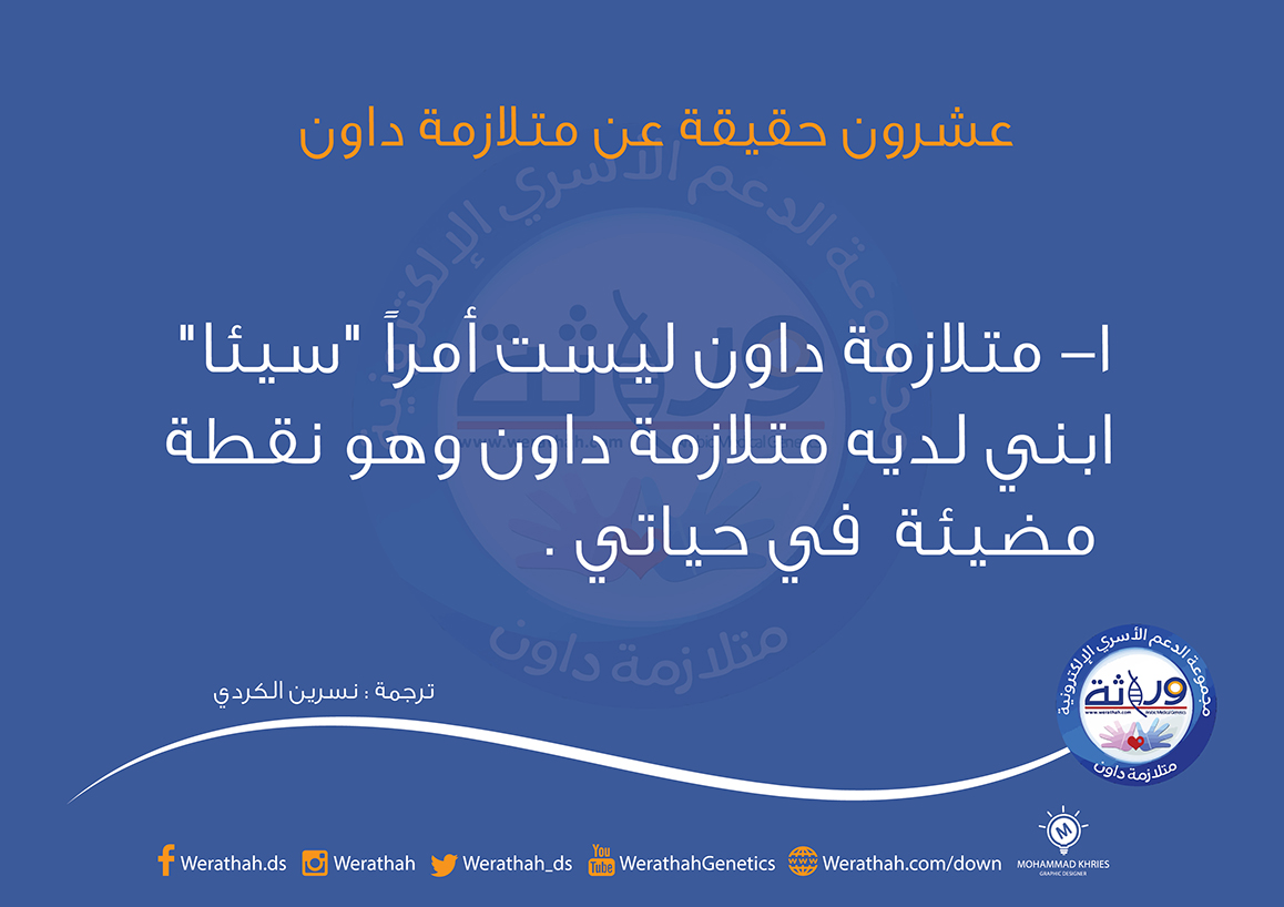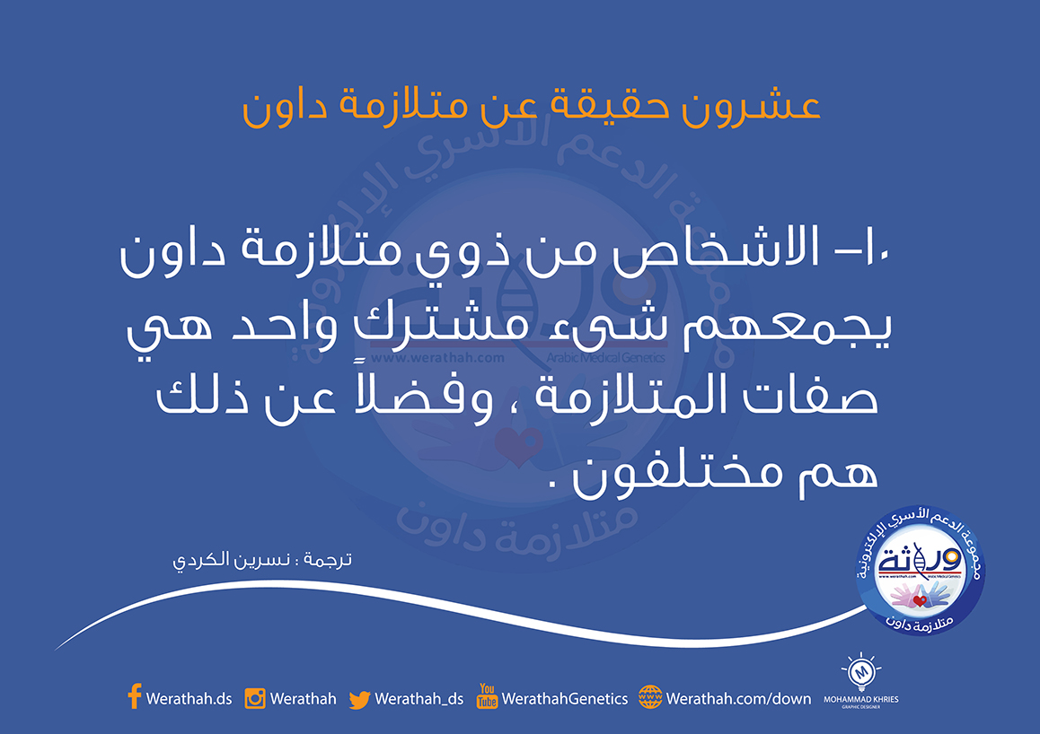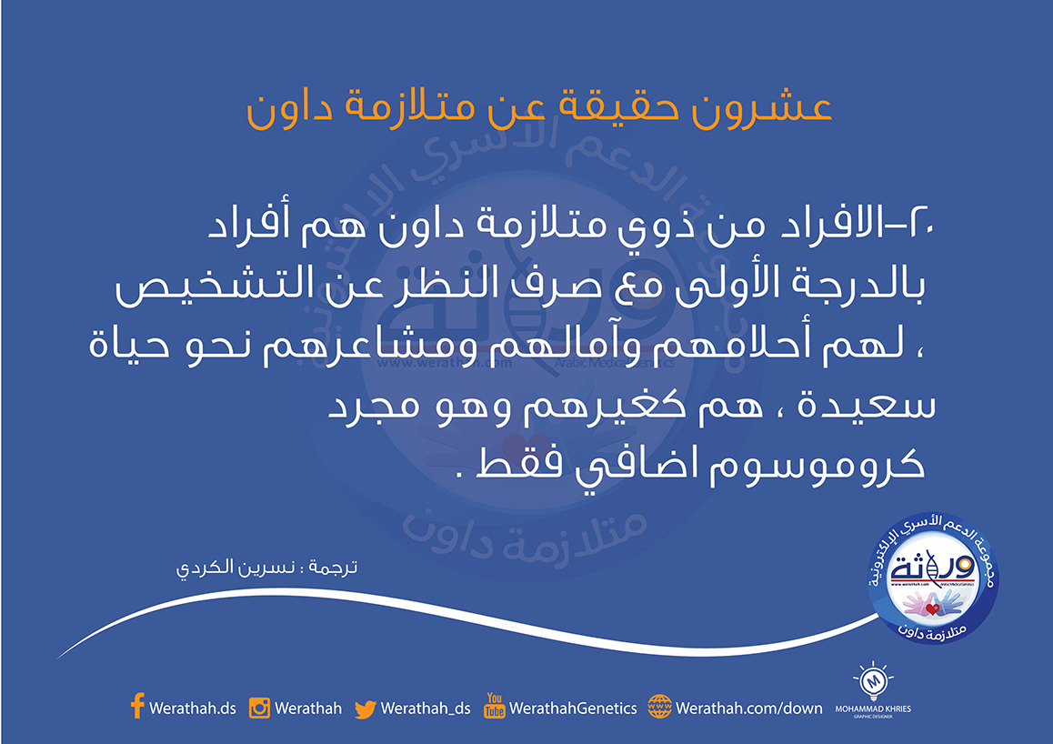 20-الأفراد من ذوي متلازمة داون هم أفراد بالدرجة الأولى مع صرف النظر عن التشخيص، لهم أحلامهم وآمالهم ومشاعرهم نحو حياة سعيدة. هم كغيرهم وهو مجرد كروموسوم إضافي فقط.