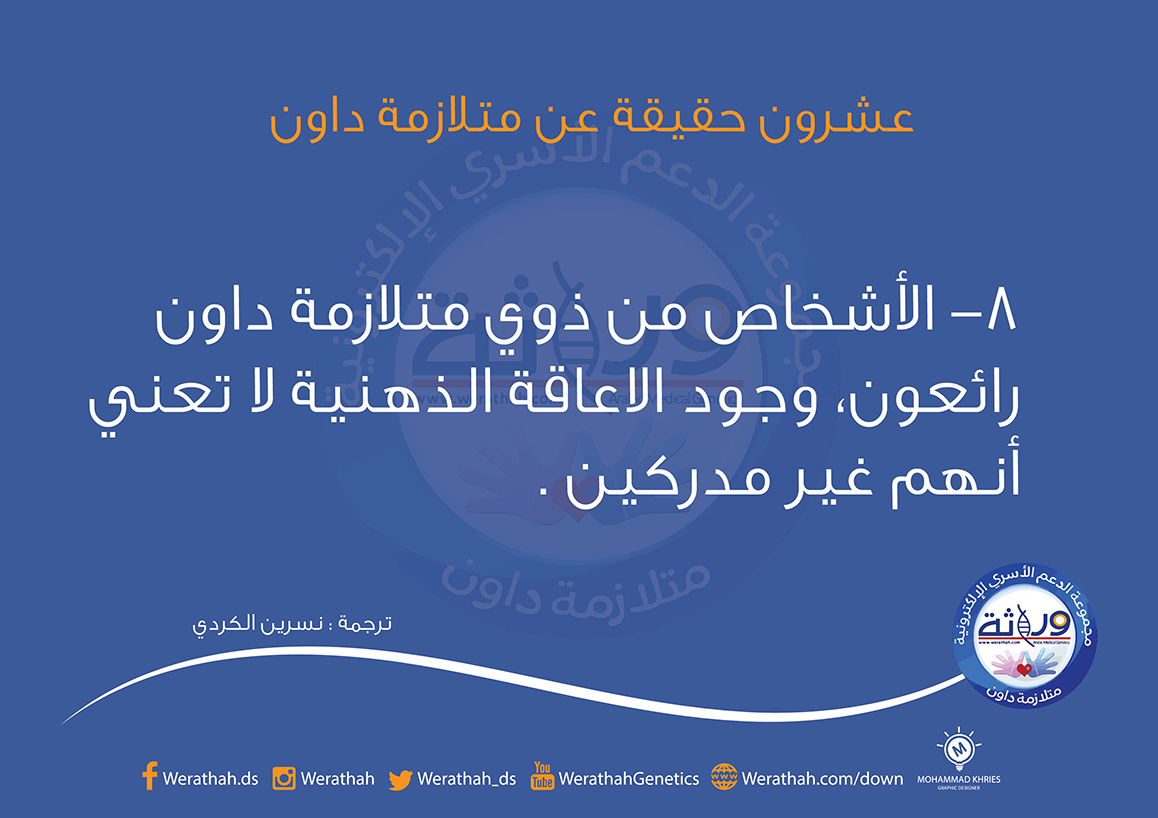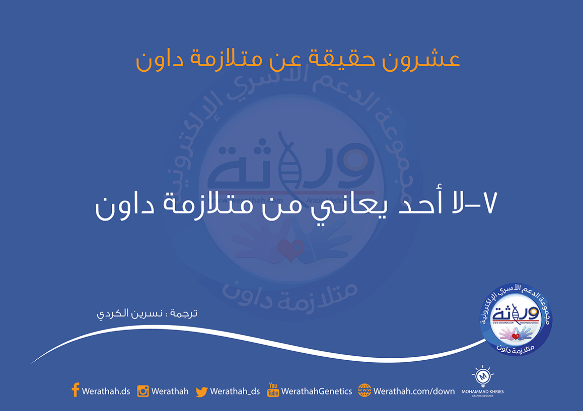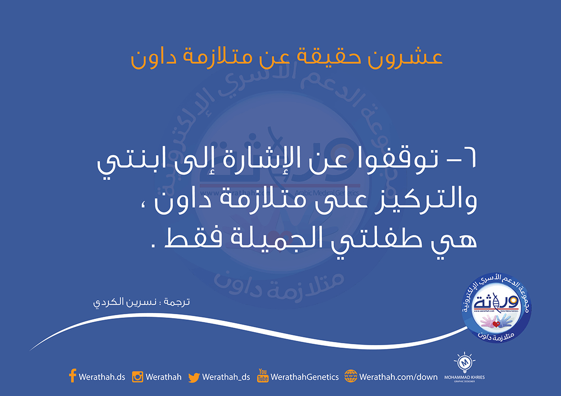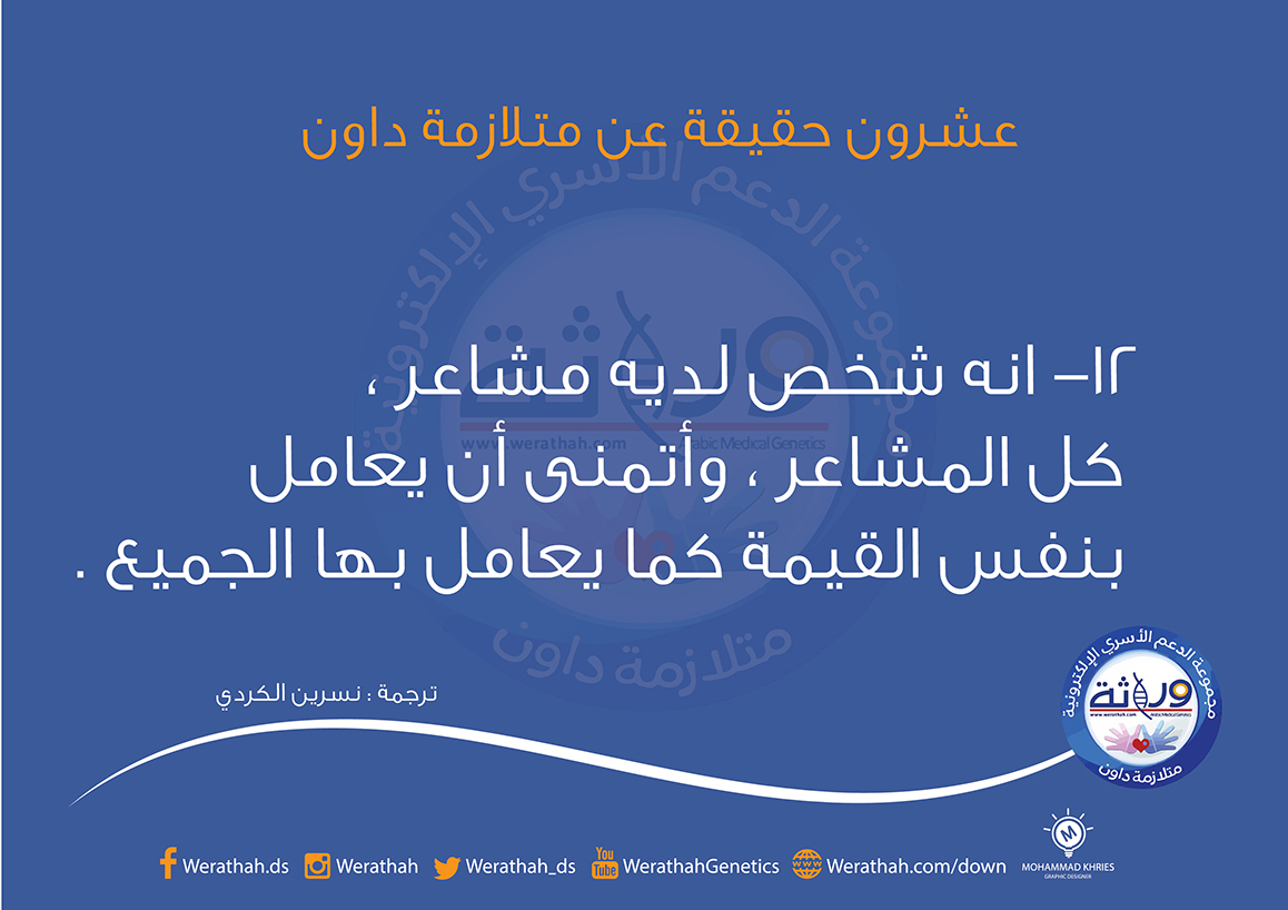 20-الأفراد من ذوي متلازمة داون هم أفراد بالدرجة الأولى مع صرف النظر عن التشخيص، لهم أحلامهم وآمالهم ومشاعرهم نحو حياة سعيدة. هم كغيرهم وهو مجرد كروموسوم إضافي فقط.
