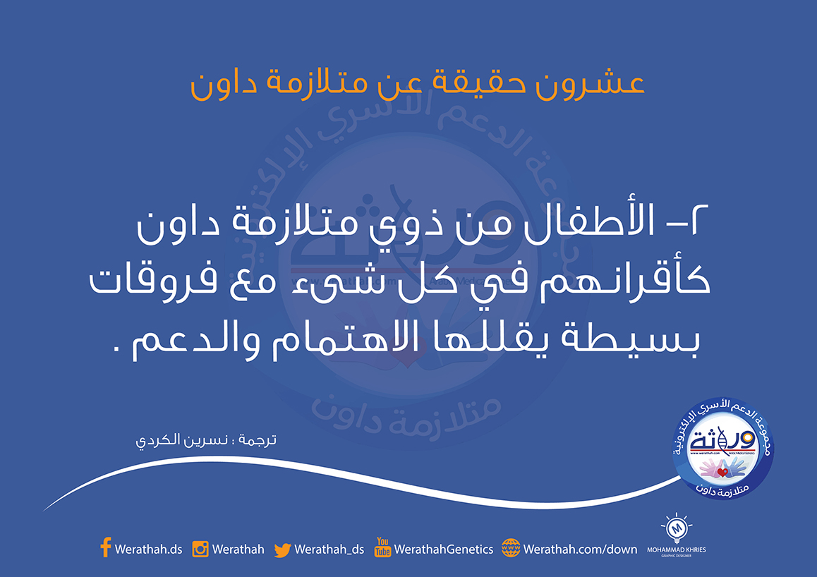 2-الأطفال من ذوي متلازمة داون كأقرانهم في كل شيء مع فروقات بسيطة يقللها الاهتمام والدعم.