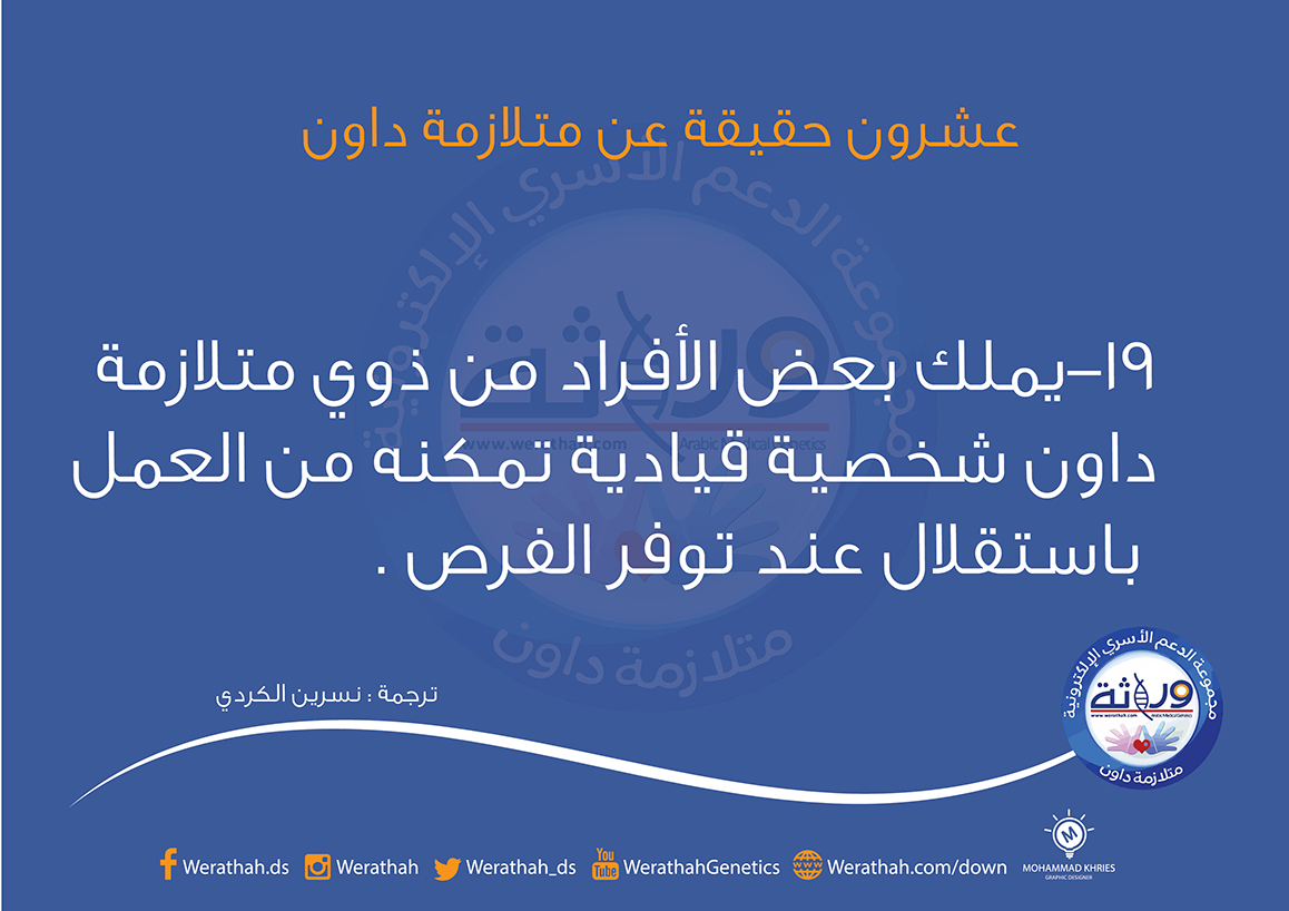 19-يملك بعض الأفراد من ذوي متلازمة داون شخصية قيادية تمكنهم من العمل باستقلال عند توفر الفرص.