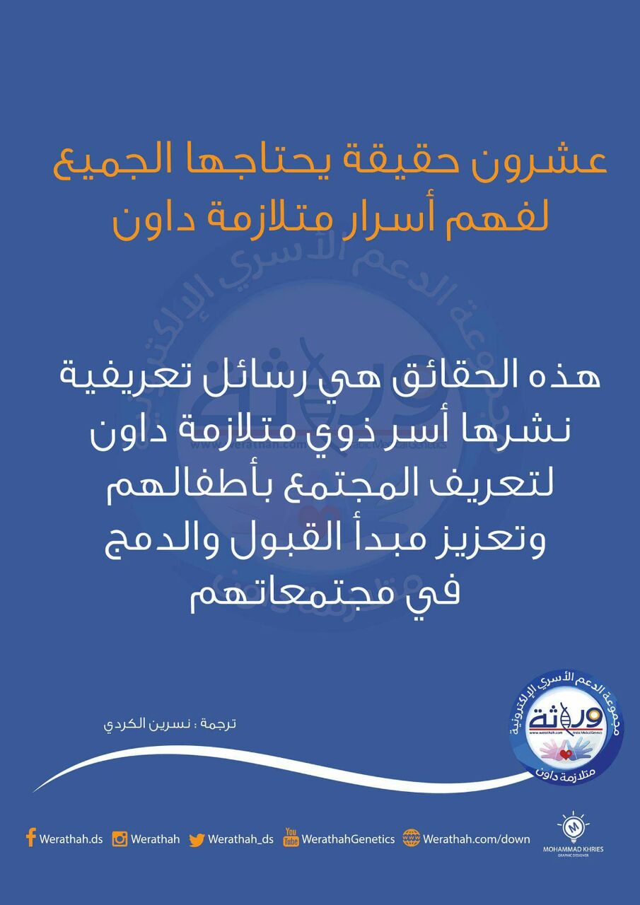 هذه الحقائق هي رسائل تعريفية نشرتها أسر ذوي متلازمة داون لتعريف المجتمع بأطفالهم وتعزيز مبدأ القبول والدمج في مجتمعاتهم.