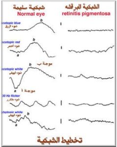و يبدأ ضعف البصر بصعوبة في الإبصار في الليل(العشى الليلي) و خاصة مجال الرؤية الجانبي ثم يمتد إلى أن يشمل مركز البصر في الوسط و ذلك نتيجة لضمور الخلايا البصرية في الشبكية.و نظرا لصعوبة معرفة الشخص الذي سوف يصاب بمشكلة في البصر فانه يلزم فحص جميع من لديهم صمم أو ضعف سمع من قبل طبيب العيون للاكتشاف تبرقش الشبكية(Retinitis Pigmentosa) مع إجراء تخطيط للعصب البصري(VER) و تخطيط للشبكية(ERG ). و إعادتها في بعد عدة سنوات بشكل دوري خاصة في الأسر التي لديها تاريخ مرضي يؤشر إلى إصابة البصر مع الصمم.كما يجرى اختبار للتوازن Electronystagmography |